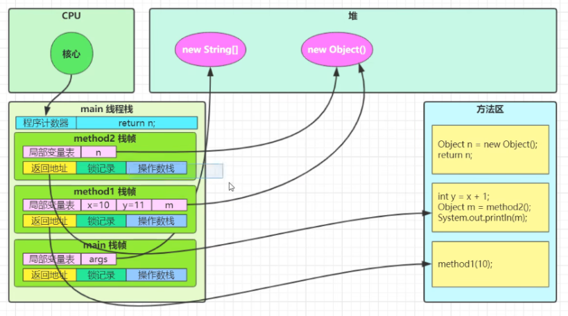 7,执行method2方法,在堆区中创建了一个object的对象,并且返回,所以method1中m的值实际上是这个object对象