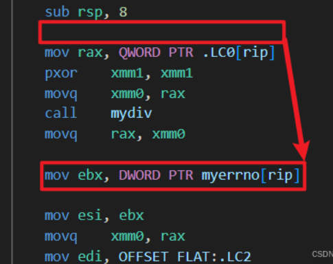 将原来在sub rsp,8下方的mov ebx, DWORD PTR myerrno[rip]放到movq rax,xmm0的下方