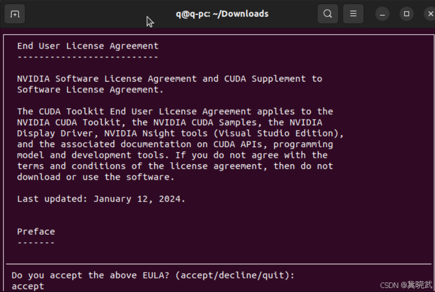 2.输入 “accept” 接受协议: