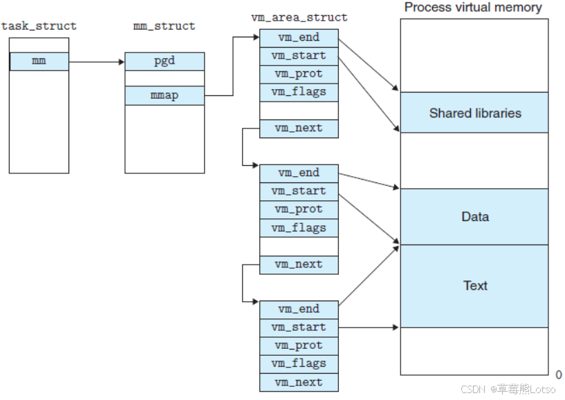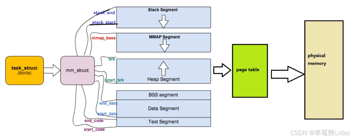 先来看看由 task_struct 到 mm_struct ,进程的地址空间的分布情况: