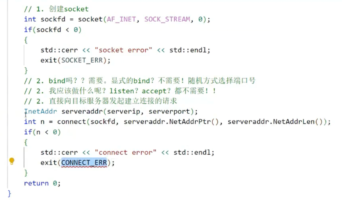 客户端无需手动bind本地端口,系统会自动分配一个未使用的端口,这是客户端和服务器的核心区别之一。