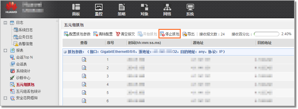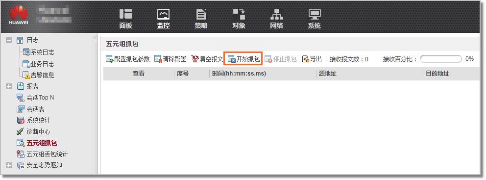 通常,在不关心报文内容仅为了判断是否存在报文交互时,可以使用Web方式的五元组抓包。比如:查不到会话信息时,可以使用Web方式的五元组抓包功能,判断设备是否收到转发相关报文。