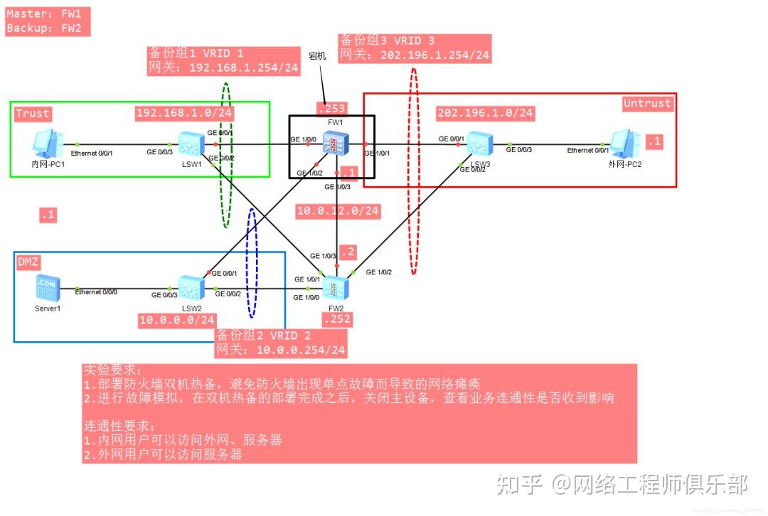 [USG6000V1]int g1/0/0[USG6000V1-GigabitEthernet1/0/0]vrrp vrid 2 virtual-ip 10.0.0.254 standby [USG6000V1-GigabitEthernet1/0/0]int g1/0/1[USG6000V1-GigabitEthernet1/0/1]vrrp vrid 1 virtual-ip 192.168.1.254 standby [USG6000V1-GigabitEthernet1/0/1]int g1/0/2[USG6000V1-GigabitEthernet1/0/2]vrrp vrid 3 virtual-ip 202.196.1.254 standby