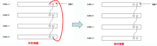 1)红色标注的堆叠线为冗余链路,此时交换机处于环形堆叠状态;而不接那条红色冗余链路,则此时交换机处于线性堆叠状态;