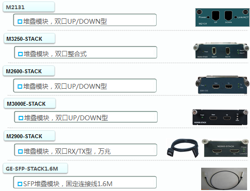 1)通过特定的扩展堆叠模块+特定的连接线缆进行堆叠,带宽1Gbps~10Gbps间;高效,可靠,带宽高,缺点是成本高,堆叠成员设备互连的距离受到堆叠线缆长度的约束。例如M2900-STACK堆叠模块。