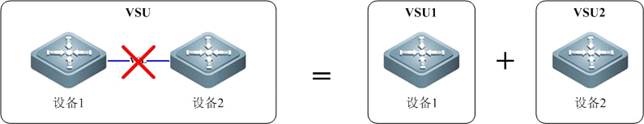 如下图所示,一个VSU形成后,由于VSL链路故障,导致VSU中两相邻成员设备物理上不连通,一个VSU变成两个VSU,这个过程称为VSU分裂。