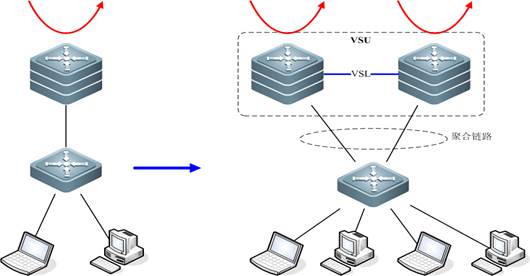 如图所示,当边缘交换机上行带宽增加时,可以增加新交换机与原交换机组成VSU系统来实现。将成员设备的多条物理链路配置成一个聚合组,可以增加到中心交换机的带宽。而对中心交换机的而言,边缘交换机的数量并没有变化,物理上的两台交换机看起来就是一台交换机,原有交换机会将当前的配置批量备份到新加入的交换机。因此,这种变化对网络规划和配置影响很小。