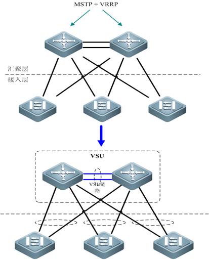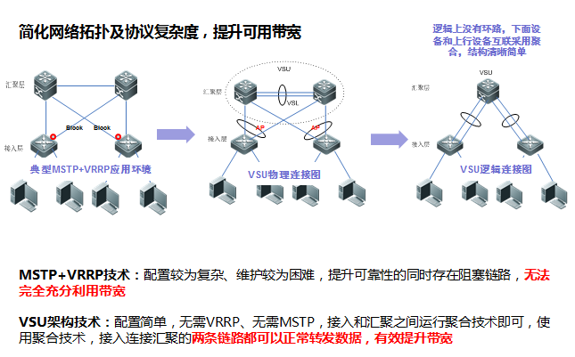 VSU是一种将多台设备虚拟成一台设备来管理和使用的技术,能够显著减低管理复杂度,降低拓扑逻辑复杂度,和MSTP+VRRP网络相比,VSU通常和周边设备使用聚合口进行连接,能够有效利用冗余链路的同时提升系统的转发能力。