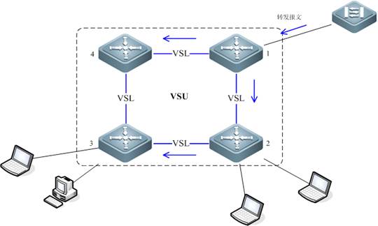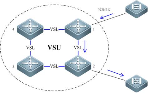 VSU 采用分布式转发技术实现报文的二/三层转发,最大限度的发挥了每个成员的处理能力。VSU 系统中的每个成员设备都有完整的二/三层转发能力,当它收到待转发的二/三层报文时,可以通过查询本机的二/三层转发表得到报文的出接口(以及下一跳),然后将报文从正确的出接口送出去,这个出接口可以在本机上也可以在其它成员设备上,并且将报文从本机送到另外一个成员设备是一个纯粹内部的实现,对外界是完全屏蔽的,即对于三层报文来说,不管它在 VSU 系统内部穿过了多少成员设备,在跳数上只增加1,即表现为只经过了一个网络设备。