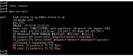 查看接口收发包计数,使用clear count清楚旧计数后观察设备接口是否仍有新的收发包计数,同时检查错误包计数: