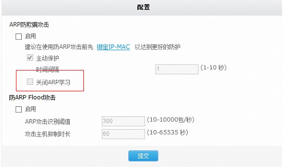 如果步骤2检查为正常情况,则检查设备配置,查看是否配置了关闭ARP学习、IP-MAC唯一性绑定功能,因为关闭了ARP学习则设备将不回应所有的ARP请求,如果未通过手动绑定静态ARP则无法学习ARP导致业务中断,同时确认上下游的IP地址不要做IP-MAC唯一性绑定