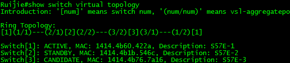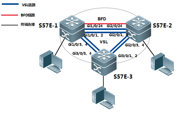 1、组建三台57E环网,S57E-1、S57E-2和S57E-3组成虚拟设备VSU(domain ID为1),S57E-1的优先级是200,S57E-2的优先级是150,S57E-3的优先级是100。如下图所示,VSL链路采用两两互联的方式连接。